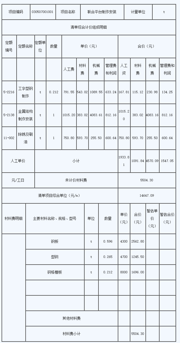 1.某聚乙烯装置中的联合平台金属结构制作安装工程(工程量清单统一项目编码为030507001),工程内容包括制作安装和刷油,安装按以下数据及要求进行招标和投标。
