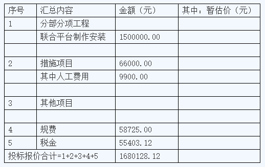 (2)假设该工程联合平台制作安装的综合单价为15000元/t,制作安装费中的人工费、材料费和机械费分别占综合单价的15%、10%和30%。其余条件不变,计算该金属结构制安工程的投标报价,将计算结果填入“单位工程投标报价汇总表”(答题纸表6- II -2)中。