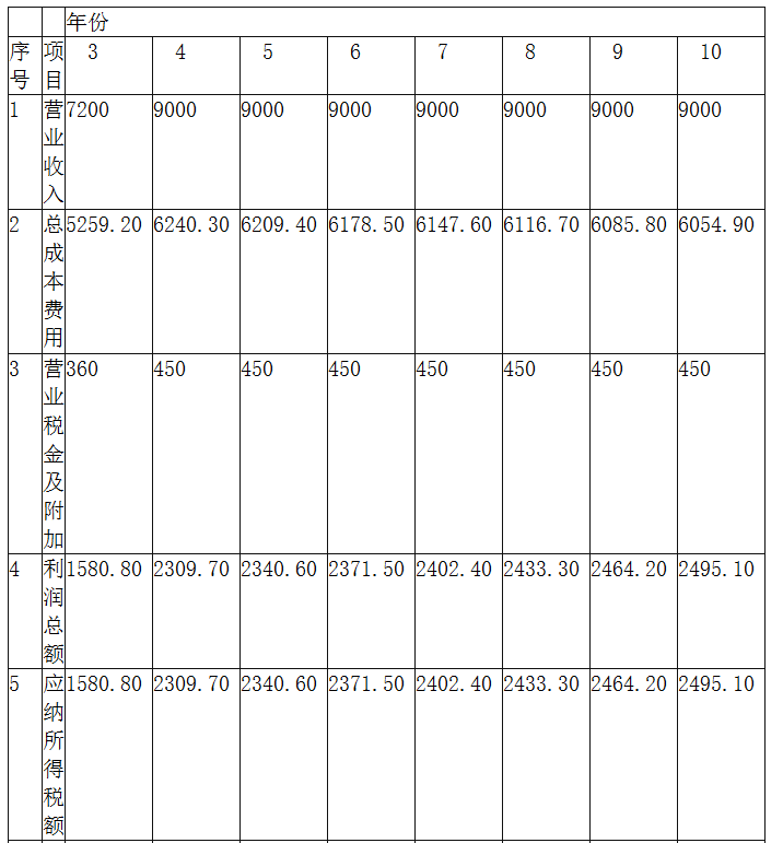 第4~10年营业收入=6000×1.5=9000(万元),营业税金及附加=9000×5%=450(万元)