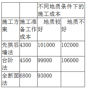 当采用全断面法施工时,在地质条件不好的情况下,须改用其他施工方法,如果改用先拱后墙法施工,需再投入3300万元的施工准备工作成本。如果改用台阶法施工,需再投入1100万元的施工准备工作成本。