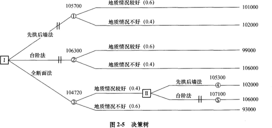 由于机会点5的成本期望值大于机会点4的成本期望值,所以地质情况不好时,应采用先拱后墙方法。