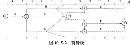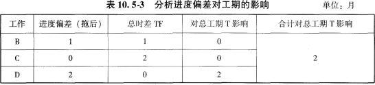 2.根据第6个月末检查结果,在图10.5-2上绘制前锋线,并分析第6个月末B、C、D三项工作的进度偏差,如果后6个月按原计划进行,分析说明B、D工作对工期的影响,填入表10.5-3。