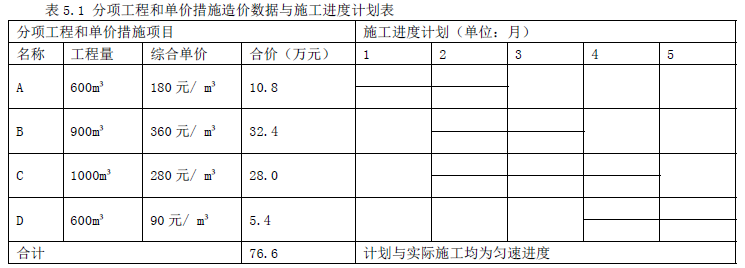 某工程项目发包人与承包人签订了施工合同,工期5 个月。分项工程和单价措施项目的造价数据与经批准的施工进度计划如表5.1 所示;总价措施项目费用9 万元(其中含安全文明施工费3 万元):暂列金额12 万元。管理费和利润为人材机费用之和的15%。规费和税金为人材机费用与管理费、利润之和的10%。
