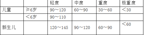 患儿,1岁。以面色苍白1个月入院查体:心率138次/分,心尖区闻及IV级收缩期杂音,血象:HB50g/L,RBC2.54×1012/L,临床诊断为缺铁性贫血,该患儿的贫血程度如何判定