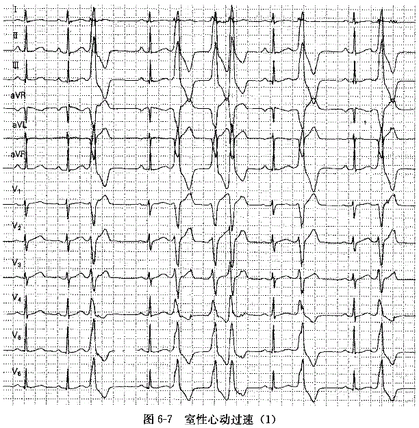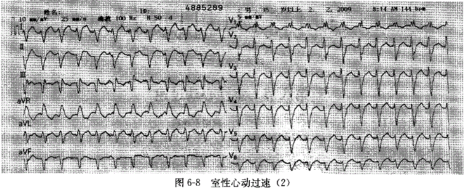 图6-7示3个室性期前收缩连续出现;QRS波群形态宽大畸形,时间超过0.12s,ST-T波方向与QRS波群主波方向相反。图6-8示连续出现宽大畸形的QRS波群形态,QRS波群时间超过0.12s;ST-T波方向与QRS波群主波方向相反;心室率为144次/分,心律规则。