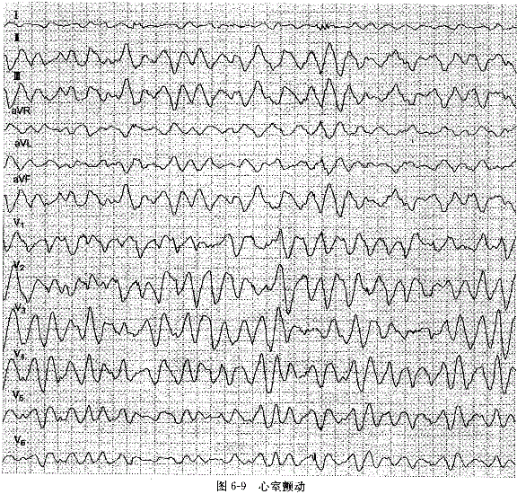 图6-9示全部导联波形、振幅与频率均极不规则;无法辨认QRS波群、ST段和T波。