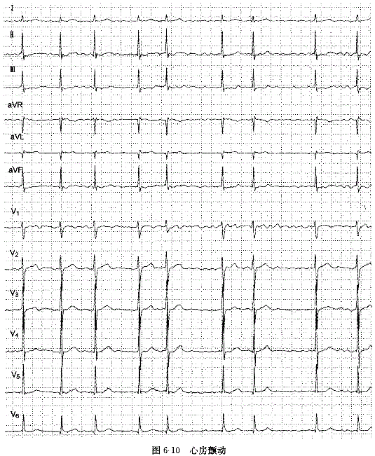 图示P波消失,代之以小而不规则的f波,频率在350~600次/分;心室律极不规则,心率100~160次/分;QRS波群形态正常。