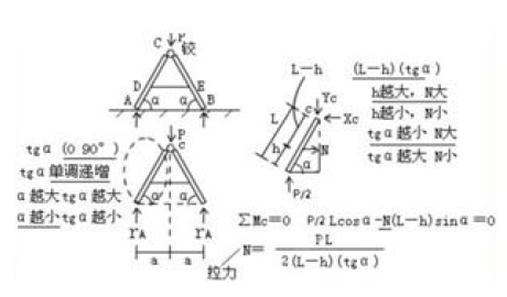 结构平衡的条件,参考下图,夹角α越小、绳子位置h 越大,拉力越大。