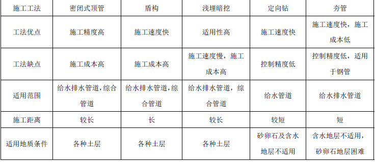 不开槽法施工方法与使用条件见下表: