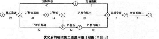 1.绘制优化后的该桥施工网络进度计划,并给出关键线路和节点工期。