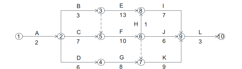 调整后的网络图关键线路为:A→C→F→K→L。此时总工期为:2+7+10+9+3=31 周。