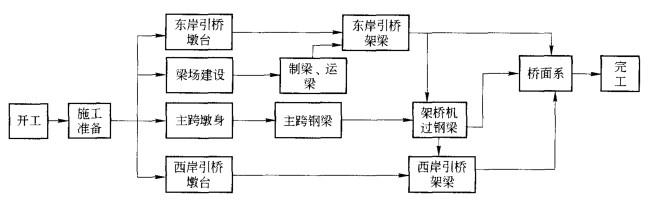 某施工单位中标一座铁路大桥(施工范围不含图中阴影部分),该桥跨越某三级通航河流,主跨为下承式钢梁,架桥机运梁车均可以在上面行使。边跨为32m简支T形梁,要求现场制梁,采用公铁两用架桥机架梁,工期要求20个月,孔跨布置详见下图。