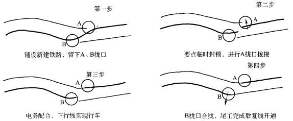 (3)要点临时封锁线路,快速拨接,电务配合,形成单向施工;