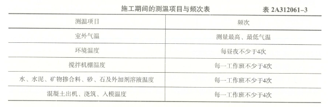 见表2A312061-3施工期间的测温项目与频次表,冬期施工期间搅拌机棚温度测温频次每一工作班不少于4次;外加剂溶液温度测温频次每一工作班不少于4次。