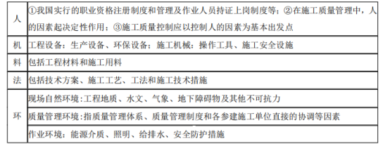 影响施工质量的主要因素有"人、材料、机械、方法及环境"等五大方面,即"4M1E":