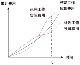 本题考查的是赢得值法。费用偏差(CV)=已完工作预算费用(BCWP)—已完工作实际费用(ACWP),当费用偏差(CV)为负值时,即表示项目运行超出预算费用;当费用偏差(CV)为正值时,表示项目运行节支,实际费用没有超出预算费用。t1时点已完工作预算费用小于已完工作实际费用,所以费用超支。进度偏差(SV)=已完工作预算费用(BCWP)—计划工作预算费用(BCWS),当进度偏差(SV)为负值时,表示进度延误,即实际进度落后于计划进度;当进度偏差(SV)为正值时,表示进度提前,即实际进度快于计划进度。t1时点已完工作预算费用大于计划工作预算费用,所以进度超前。